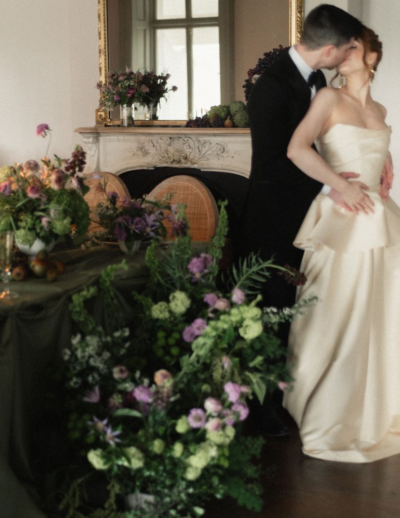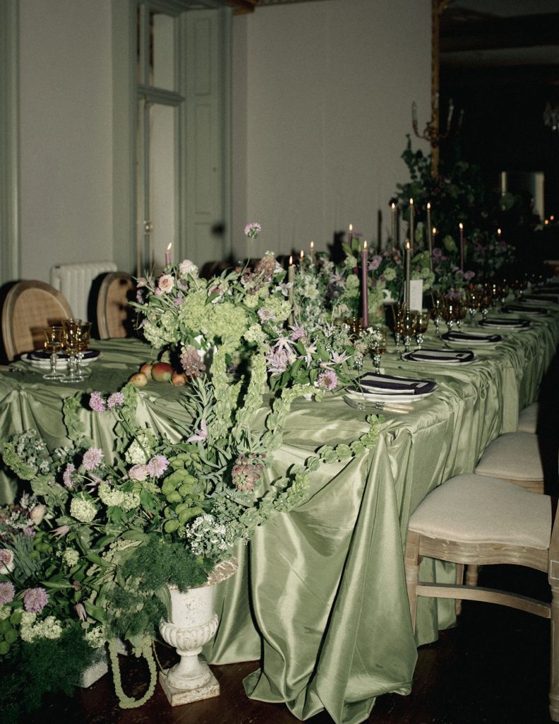Moss green works beautifully when balanced with soft ivory, taupe, and warm nude tones, or as we can see here- beautiful purple, making floral choices incredibly important. Go for asymmetrical arrangements with organic movement—think untamed white roses, delicate orchids, and airy foliage with subtle golden branches for warmth. Cake Table Tip: Mirroring floral elements on the cake table is a game-changer. Opt for a few strategically placed blooms. If using sugar flowers, let them reflect the wedding’s floral choices for a cohesive, elegant look.